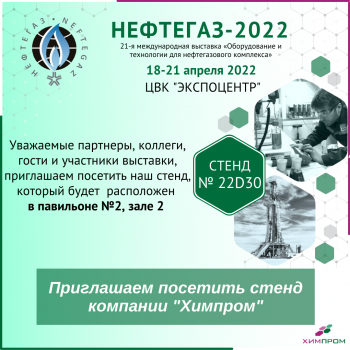 Приглашаем посетить стенд компании «Химпром» №22D30 (павильон 2, зал 2) на главной выставке нефтегазовой отрасли - "Нефтегаз-2022", которая состоится 18-21 апреля 2022 года в ЦВК "ЭКСПОЦЕНТР".