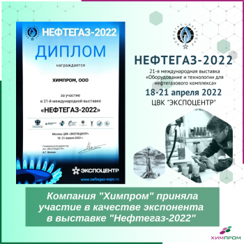 С 18 по 21 апреля компания «Химпром» приняла участие в качестве экспонента в 21-й международной выставке оборудования и технологий для нефтегазового комплекса «Нефтегаз-2022», которая состоялась в Москве в центральном выставочном комплексе «ЭКСПОЦЕНТР».