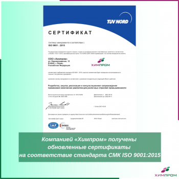 Компанией «Химпром» получены обновленные сертификаты на соответствие СМК стандартам ISO 9001:2015