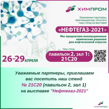 Уважаемые партнеры, коллеги и друзья, компания «Химпром» приглашает Вас посетить стенд № 21С20 (павильон 2, зал 1) на главной выставке нефтегазовой отрасли «Нефтегаз-2021» в Экспоцентре.
