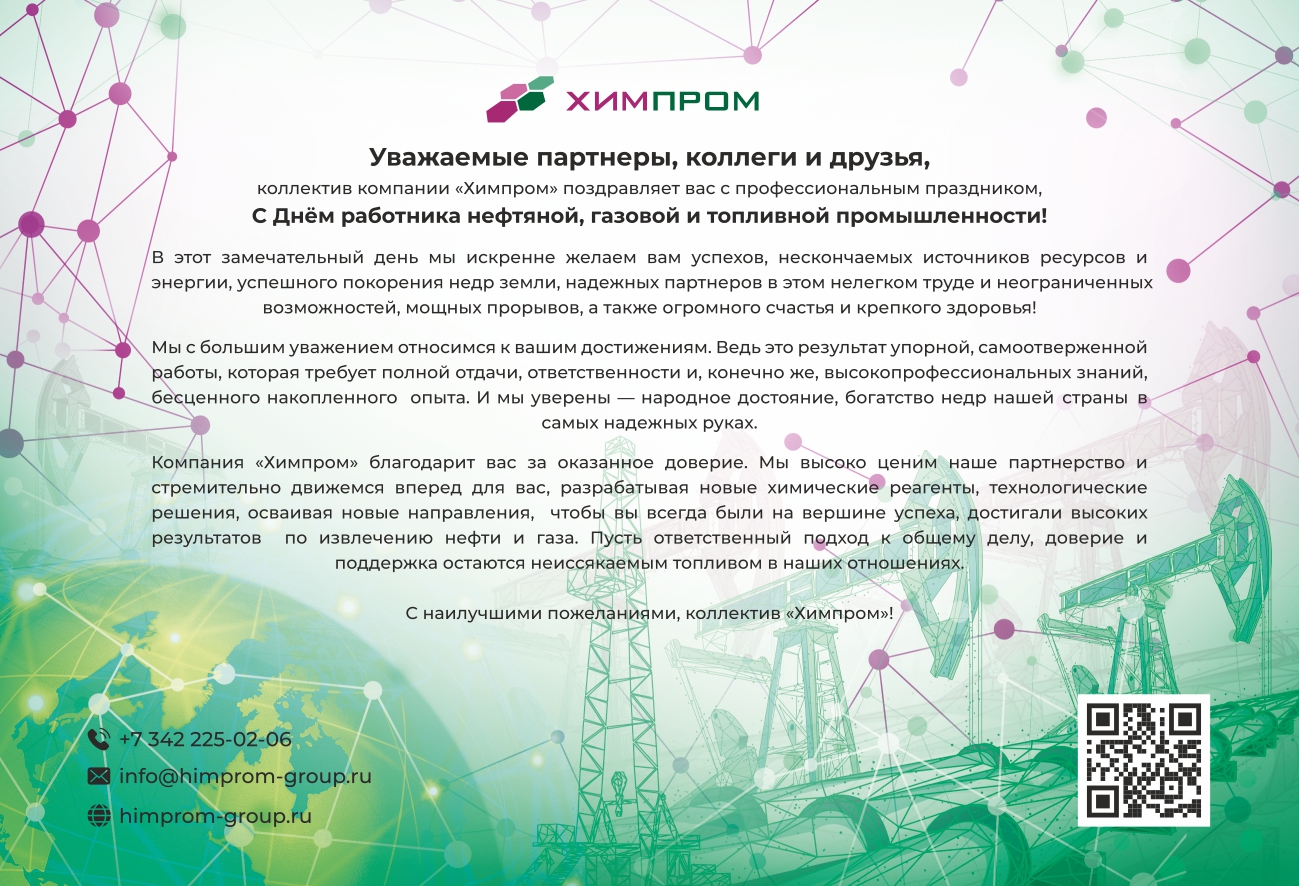 Уважаемые партнеры, коллеги и друзья, коллектив компании «Химпром» поздравляет вас с профессиональным праздником, с Днём работников нефтяной, газовой и топливной промышленности!