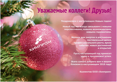 Коллектив ООО «Химпром» искренне поздравляет коллег, партнеров, друзей с Новым 2018 годом. Пусть наступающий год принесет удачу и приумножит успех. Всего самого доброго вам и вашим близким в наступающем 2018 году!